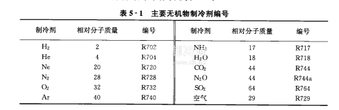 (1)無機物:無機物的編號首位為7,7后面的數(shù)字是該無機物的相對分子質(zhì)量的整數(shù)部分。對于相對分子質(zhì)量的整數(shù)部分相同的物質(zhì),在后面加英文字母來區(qū)別。主要無機物制冷劑的編號見表5-1,