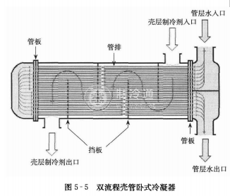 1,冷凝器冷凝器是一個制冷劑向外放熱的熱交換設備。自壓縮機經油分離器來的制冷劑蒸氣進人冷凝器后,將熱量傳遞給周圍介質一一水或空氣,自身因受冷卻凝結為液體。冷凝器按其冷卻介質和冷卻方式的不同,可以分為水冷卻式、空氣冷卻式、水和空氣聯合冷卻式三種類型。圖5-5和圖5-6分別為常用的雙流程殼管臥式冷凝器和強制對流空氣冷卻式冷凝器。