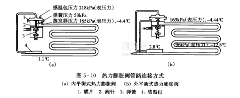 熱力膨脹閥由蒸發器出口處的溫度控制,根據結構和接受信號的不同,可以分為內平衡式和外平衡式兩種。管路連接方式如圖5-10所示。內平衡式熱力膨脹閥連接一個感溫包,感溫包裝在蒸發器出口處,用以感受蒸發器出口處的溫度。與蒸發器出口處溫度相對應的壓力作用在膜片的一側,蒸發器入口處的制冷劑蒸氣壓力和彈簧壓力作用在膜片的另一側,膜片與閥針相連,可以調節制冷劑的流量。當蒸發器的負荷增大時,出口蒸氣過熱度增加,膜片上部壓力變大,于是閥針下移,有更多的制冷劑流入蒸發器,從而降低出口處的過熱度;反之亦然。外平衡式熱力膨脹閥增設了一條外部連接管,將膜片下部空間與蒸發器出口連通,即膜片下部的制冷劑蒸發壓力就不是蒸發器的進口壓力和彈簧壓力之和,而是蒸發器的出口壓力與彈簧壓力之和。這樣使膨脹閥所提供