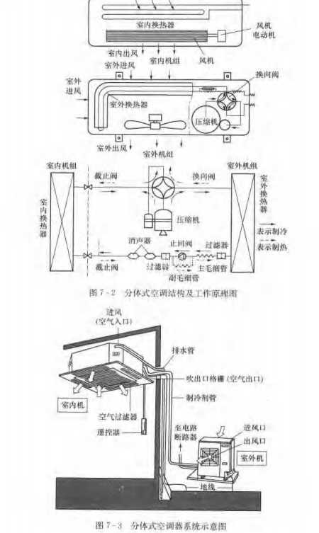 分體式空調器分體式空調機組是把制憐壓縮機、冷凝器(熱泵運行時蒸發器)同室內空氣處理設備分開安裝的空調機組,見圖7-2.冷凝器與壓縮機一起組成一個機組,置于室外,稱室外機:空氣處理設備組成另一機組,置于室內,稱室內機。室內機利和室外機之間用制冷劑管路連接。