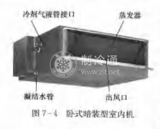 臥式暗裝型需暗裝在吊頂內,采用側送風型式,因此多用于商用和層高較高的別里。它的結構與集中式空調的風機盤管十分相似,見圖?·4.室內空氣經回風口被離心風機吸入后,經蒸發器處理直接送人房間內。臥式暗裝型室內機在安裝時,其進出風口尚需接一小段風管和百葉送、回風口。
