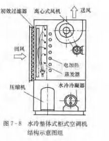 恒溫恒濕空調機組一般為立柜式,有項部設置側吹風口直接往室內送風的直吹型,也有結構類似圖7-8通過頂部出風口送風的風管型。前者機組容量一般較小,可直接置于空調房間內使用。恒溫世濕空調機組的外形與立柜式冷風機組相差不大,有的廠家生產的這兩種產品為同一個機組構架,僅內部織成的部件有所不同。