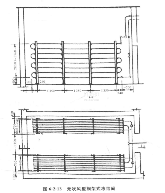 擱架式排管在凍結(jié)間的布置有三種方案(見圖6-2-12),圖中(a)只適用于小批量生產(chǎn)服務(wù)性小冷庫。批量生產(chǎn)較大的凍結(jié)間宜采用方案C,以利提高裝卸效率。