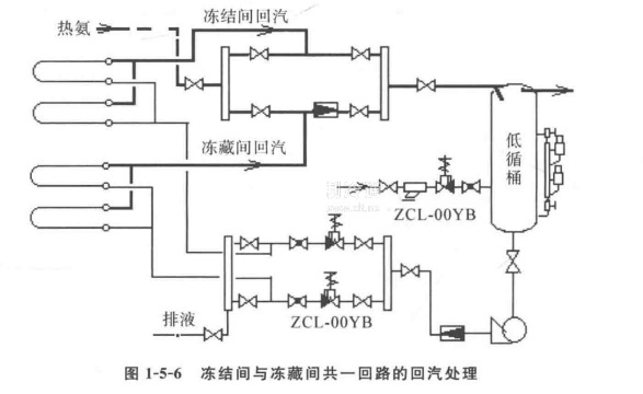 凍結(jié)間自控回路形式與圖1-5-3類似,不同點(diǎn)在于回汽管道上一般不采用常閉型電磁主閥,而改用雙電磁主閥或常開型電磁主閥,以免在回汽管上引起過大的溫度降。