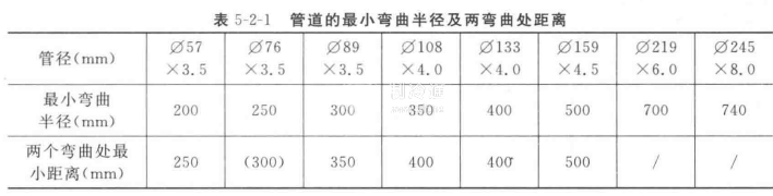 2.在受限空間布置彎管時,應考慮其允許彎曲半徑,管子外徑在D57mm以下者,其彎曲半徑不得小于其公稱直徑的3.5倍,大于D57mm的管子,其彎曲半徑不應小于規定的最小值。兩個彎曲處的間距也有一定的要求,見表5-2-1。一般情況下,管道的彎曲半徑按管外徑的四倍進行彎曲。管道離墻或管與管之間的凈間距不宜小于90mm(包有隔熱層的以隔熱層外壁為準)。壓縮機的吸排汽管的凈間距要適當加大,一般不小于250mm。