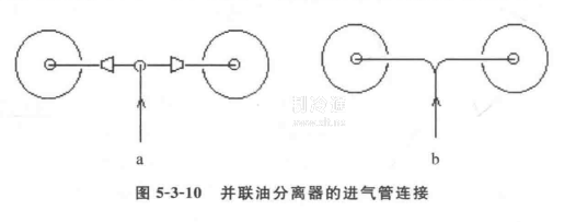 當系統(tǒng)中選用兩個以上的油分離器時,壓縮機至油分離器的排氣支管應采用變徑管圖5-3-10(a)或羊角彎連接圖5-3-10(b)以保證氣流分配均勻,提高分油效果。