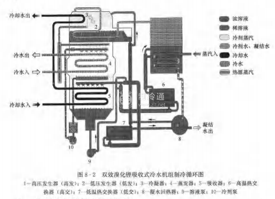 雙效溴化鋰吸收式冷水機組由高壓發生器《高發)、低壓發生器(低發)、冷凝器、蒸發器、吸收器、高溫熱交換器(高交)、低溫熱交換器(低交),凝水回熱器、溶液泵、冷劑泵等主要的部件和設備組成。如圖8-一2所示為雙效溴化鋰吸收式冷水機組的制冷循環圖。