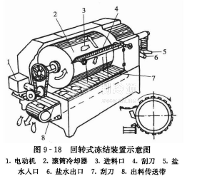 送帶再給凍品稍施加壓力,使它與回轉筒表面接觸得更好。轉筒回轉一周,完成食品的凍結過程。凍結食品轉到刮刀處被刮下,刮下的食品由傳送帶輸送到包裝生產線。