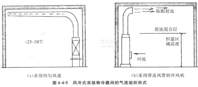 冷藏間內的氣流組織,要求庫內各處空氣流速要均勻,貨間風速不大于0.5/s,要求庫房的平頂,墻面要平整,冷風機出口可配置均勻送風道或使用帶送風管的冷風機,見圖6-4-5冷風機送出的冷空氣沿冷藏間平頂以貼附射流射到對墻,引射混合后形成了一個很大的回旋渦流,貨物應處于此循環冷空氣的回流區。