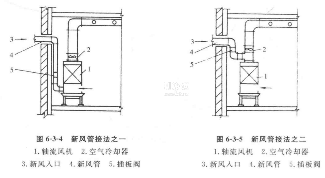 (1)利用冷風(fēng)機(jī)的通風(fēng)機(jī)作為吸入新鮮空氣的設(shè)備,其新風(fēng)管與冷風(fēng)機(jī)的連接方法有兩種。