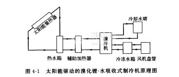 太陽能吸收式制冷,如圖4-1所示主要包括兩大部分:太陽能熱利用系統(tǒng)以及吸收式制冷機(jī)。太陽能熱利用系統(tǒng)包括太陽能收集、轉(zhuǎn)化以及貯存等構(gòu)件,其中最核心的部件是太陽能集熱器。適用于太陽能吸收式制冷領(lǐng)域的太陽能集熱器有平板集熱器、真空管集熱器、復(fù)合拋物面聚光集熱器、以及拋物面槽式等線聚焦集熱器。