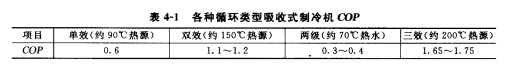 單效、兩級制冷機(jī),熱力系數(shù)較低,三效乃至四效等更復(fù)雜的制冷循環(huán)機(jī)型,仍處于試驗(yàn)研究階段,目前在市場上應(yīng)用最廣泛的是雙效型機(jī)組。但是由于雙效制冷機(jī)的能源利用率仍然不及傳統(tǒng)的蒸氣壓縮式制冷機(jī),而三效制冷機(jī)由于COP值較高,能源利用率已經(jīng)可以超過傳統(tǒng)的蒸氣壓縮式制冷機(jī),因此三效以及多效機(jī)組將是今后吸收式制冷技術(shù)發(fā)展的一個(gè)重要方向。各種循環(huán)類型溴化鋰-水吸收式制憐機(jī)的COP見表4-1。