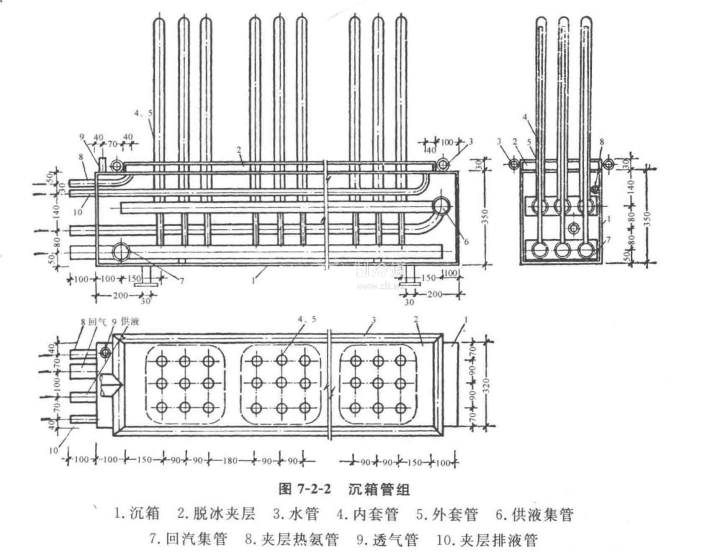 (1)指形蒸發管沉箱 它由5~6組8~9根套管構成的指形管組和帶有供液集管、回氣集管、脫冰夾層、水管的沉箱組成,其結構見圖7-2-2。