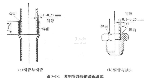 紫銅管的焊接采用插入形式,如圖9-2-1所示。在圖9-2-1(a)中,紫銅管的一端用銅沖模沖成擴口,內(nèi)表面用砂布擦亮,將另一根未擴口的銅管一端的外表面也擦亮,并插入擴口壓緊,以免焊接時焊汁從間隙流人管內(nèi);焊接時最好將管子垂直安放。