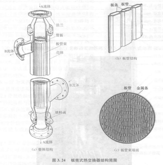 板殼式熱交換器構造和工作原理可分為板管束和殼體兩大部分,其整體結(jié)構如圖3.24()所示。板束相當于管殼式的管束,其中每一個板束元件是由兩塊冷壓成形(或爆炸成形等)的金屬板條成對地在接觸處嚴密地焊接在一起,構成的一個包含多個扁平流道的板管(圖3.24(b)。在熱交換器中,這些扁平狀的板管流道構成板殼式熱交換器的板程,相當于管殼式熱交換器的管程,而每一個板束元件則相當于一根管子。許多個寬度不等的板管按一定次序排列。為保持板管之間的間距,在相鄰板管的兩端鑲進金屬條,并與板管焊在一起。板管兩端部便形成管板,從而使許多板管牢固地連接在一起構成板管束。板管束的端面呈現(xiàn)若干扁平的流道(圖3.24(?)),板束中間的板間距是靠板束元件上的凸窩來保持的。板管束裝配在殼體內(nèi),它與殼體間靠滑動密封消除縱向膨脹差。設備截面一般為圓形,也有矩形、六邊形等。A流體在板管內(nèi)流動,B流體則在殼體內(nèi)的板管間流動。板束的流道截面可以根據(jù)介質(zhì)的性質(zhì)和操作要求設計成各種當量直徑和形狀,板片的厚度較薄,一般選用0.3一1.2m不銹鋼或有色金屬板材,單板片面積通常在10m以上。