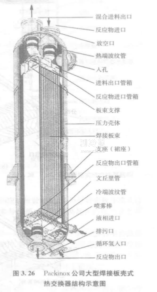 圖3.26所示為用于煉油重整裝置中的重整F/F熱交換器,一臺Packinox公司制造的大型焊接板殼式熱交換器,該熱交換器主要由一個壓力殼和一個吊掛在壓力殼體中的全焊式板束組成。冷熱介質通過板束,在板束內進行純逆流換熱。在板束與殼體接管之間,采用波紋管膨脹節來補償不銹鋼板束與低合金鋼殼體之間的熱膨脹差,殼體內沒有環流,在板束與殼體之間充滿循環氫氣(冷介質)以平衡壓力。由于冷介質壓力一般高于熱介質,通人冷介質后,避免了熱介質與殼體的接觸