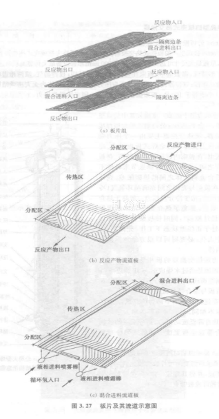 焊接的工序制造而成的。從圖(b)及圖(?)可見,在反應產物流道板與混合進料流道板的兩端各有一個分配區,而在這兩種板的中部為傳熱區,3個區的波紋形狀各不相同傳熱區全部為順人字形波紋,有利于傳熱并降低流動阻力,而分配區的波紋應便于冷熱介質在全板寬度方向的均勻分布和傳熱。