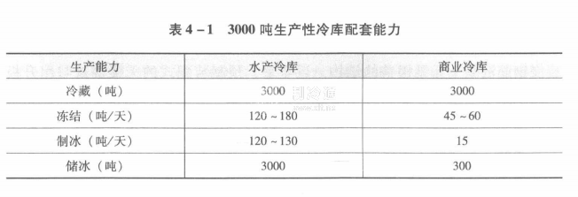 生產性冷庫主要建在食品產地附近、資源較集中的地區和漁業基地,如魚品加工廠、肉聯廠、禽蛋加工廠、乳品加工廠、蔬菜加工廠、各類食品加工廠等,是企業的一個重要組成部分。這類冷庫配有相應的屠宰車間、理魚間、整理間,有較大的冷卻、凍結能力和一定的冷藏容量,食品在此進行冷加工后經過短期儲存即運往銷售地區,直接出口與運至分配性冷藏庫作較長期的儲藏。由于它的生產方式是從事大批量、連續性的冷加工,加工后的物品必須盡快運出,故要求建在交通便利的地方。為了便于凍品外運,商業系統對1500噸以上的生產性冷庫均要求配備適當的制冰能力和冰庫;水產冷庫為了供應漁船用冰,則設有較大的制冰能力和冰庫。表4-1提供了它們的生產能力配套示例。