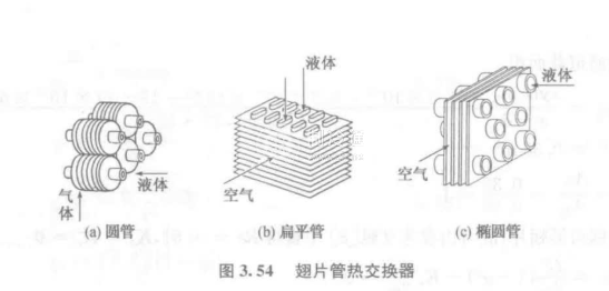 翅片管是翅片管熱交換器中的主要換熱元件,翅片管由基管和翅片組合而成,基管通常為圓管【圖3.54(a)】,也有扁平管【圖3.54(b)】和橢圓管【圖3.54(c)】.管內(nèi)、外流體通過管壁及翅片進(jìn)行熱交換,由于翅片擴(kuò)大了傳熱面積,使換熱得以改善。翅片類型多種多樣,翅片可以各自加在每根單管上【圖3.54(a)】,也可以同時與數(shù)根管子相連接【圖3.54(b)及(c)】