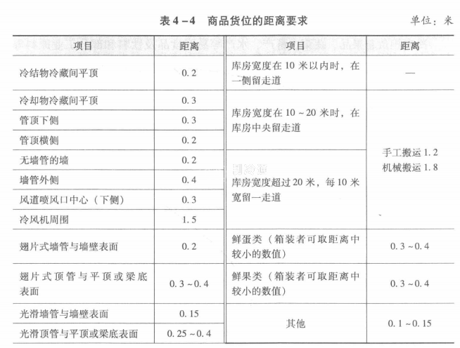 商品堆垛必須安全牢固,便于盤點、檢查、進出庫。商品貨位的堆垛與墻、頂、排管和通道的距離都有一定的要求,如表4-4所示: