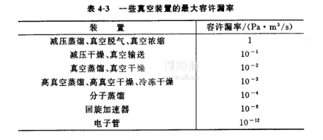 最大容許漏率就是真空系統(tǒng)正常工作情況下所容許的最大漏率。一個真空系統(tǒng),只要漏孔的漏率足夠小,使得平衡壓力低于真空系統(tǒng)的工作壓強(qiáng),這些漏孔就是允許的,表43列出了各種真空裝置的最大容許漏率