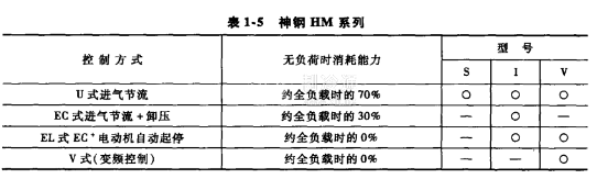 1.變頻機(jī)型的興起日本傳統(tǒng)噴油螺桿空氣壓縮機(jī)的常見(jiàn)控制模式有進(jìn)氣節(jié)流法、御壓法和電動(dòng)機(jī)自動(dòng)起停法。空氣壓縮機(jī)廠家按3種控制模式的結(jié)合形成各自的產(chǎn)品系列。例如日立公司的OSP系列中的S型與M型空氣壓縮機(jī),表1-5所示的神鋼HM系列中的S型(普通型)與I型(電腦型)空氣壓縮機(jī)。空氣壓縮機(jī)在運(yùn)行當(dāng)中,電腦根據(jù)實(shí)際空氣使用情況自動(dòng)選擇合適的控制模式,從而有效地降低能耗。