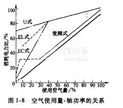 從圖1-8所示的空氣使用量軸功率消耗的關(guān)系曲線中可以看到,不管是微電腦邏輯控制下的EL式還是EC式,在滿負(fù)載以外的情況下也還是產(chǎn)生不少的能量損失。而變頻空氣壓縮機(jī)的卸載特性非常接近理想曲線(理想的空氣使用量-軸功率消耗的關(guān)系曲線為從0到對(duì)角100%的直線)。假設(shè)在平均使用空氣量40%~60%的場(chǎng)合,與普通的進(jìn)氣節(jié)流式相比,變頻空氣壓縮機(jī)節(jié)能效果可達(dá)30%~40%。神鋼K0BELI0N系列、日立OSP的V系列以及三井的ZV系列都屬于變頻類空氣壓縮機(jī)。