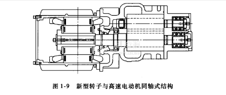 但是,為了更進(jìn)一步提高效率,日本對(duì)壓縮機(jī)結(jié)構(gòu)進(jìn)行了創(chuàng)新開發(fā)和改進(jìn)。如圖1-9所示,最新系列空氣壓縮機(jī)的最大特征是:機(jī)器中不用增速機(jī)構(gòu),而采用了轉(zhuǎn)子與高速電動(dòng)機(jī)同軸式結(jié)構(gòu)。結(jié)構(gòu)緊湊、輕量化的永久磁石同步電動(dòng)機(jī)不僅滿足了高速運(yùn)轉(zhuǎn)的要求,而且也解決了轉(zhuǎn)子軸剛性的問(wèn)題。由于這種轉(zhuǎn)子與電動(dòng)機(jī)同軸式結(jié)構(gòu)以及完全封閉的耐油性PM高速電動(dòng)機(jī)的采用,機(jī)械式油封不再需要,因此自然地也不存在機(jī)械式油封帶來(lái)的機(jī)械損失。綜上所述,因?yàn)樵陔妱?dòng)機(jī)與轉(zhuǎn)子之間沒(méi)有了能源傳遞效率上的損失,所以可以說(shuō)這是節(jié)省能耗的一種最有效的方法。與以往的空氣壓縮機(jī)相比,這種新型系列在節(jié)能方面得到了很大的提高,滿負(fù)載時(shí)提高了5.2%,在部分負(fù)載特性中最大可提高32%。