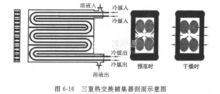 在中空夾層平板內置若干折流板,使夾層中構成一蛇形流道,在流道中放置幾根傳熱管,管內為制冷劑,管外為載冷劑。每根管子的一部分與夾層內壁直接接觸,管內制冷劑的冷量可通過管壁、平板壁傳導到平板外表面。管子的其他部分的外表面與載冷劑接觸,管內的冷量也可通過載冷劑、平板壁傳到平板外表面。若將此平板放入冷阱中,使水蒸氣在其上凝結,這樣就構成了水蒸氣與制冷劑間、水蒸氣與載冷劑間、制冷劑與載冷劑間進行熱交換,所以稱之為三重熱交換系統。