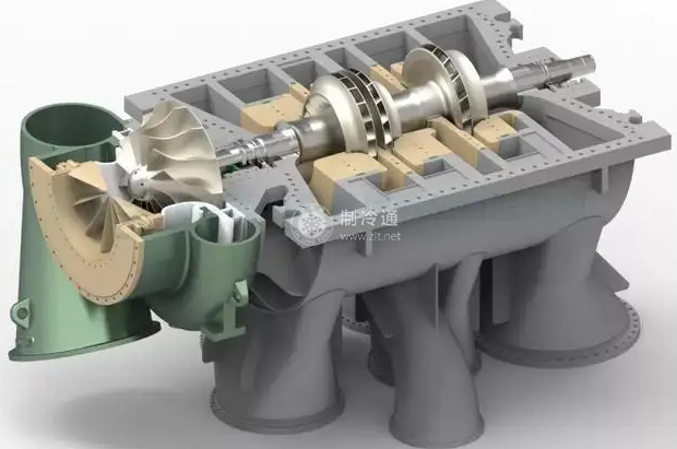 主軸帶動葉輪高速旋轉時,氣體自軸向進入,并以很高的離心力被甩出葉輪,進入具有擴壓作用的固定導葉中,在這里氣體流速急劇下降,壓力提高;隨后,氣體又被送入第二級中,進一步提高壓力;以此類推。一直到額定壓力。