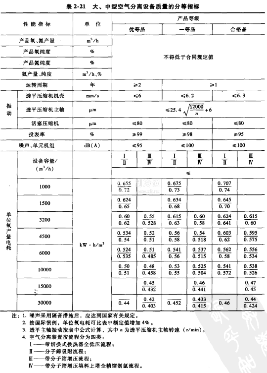 大、中型空氣分離設備質量的分等指標如表2-21所示。