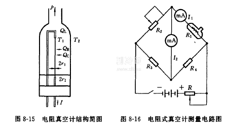 電阻真空計又稱皮喇尼(Pirani)真空計或皮氏真空計。它由外殼和管芯(包括底蓋、玻璃絕緣子、熱絲和熱絲支架等)兩部分組成。圖8-15示出了其結構簡圖,圖8-16所示的為其電路原理圖。