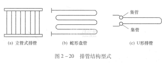 (1)空氣自然對流式蒸發器 這種蒸發器靠空氣自然對流和輻射吸收熱量,常用在冷庫中。在冷藏庫中,多采用安裝在頂棚下或墻壁四周的管束直接冷卻庫內空氣。按排管放置位置可分為頂管(掛于天棚下)、墻管(裝在墻上)和擱架管(兼作被冷卻物的擱架)。按排管結構型式可分為:立管式排管【圖2-20(a)】、蛇形盤管【圖2-20(b)】、U形排管【圖2-20(c),用作頂管】。按管束形式分,有光管和肋片管,光管外徑通常為20~60mm,肋片管的片距通常為8~12mm。