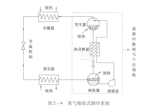 蒸氣吸收式制冷,屬物質相變蒸氣制冷方法,利用一種吸收劑將汽化的制冷劑蒸氣吸收,制冷劑汽化帶走汽化熱而產生制冷效應。蒸氣吸收式制冷系統由發生器、冷凝器、制冷劑節流閥、蒸發器、吸收器、溶液節流閥、溶液熱交換器和溶液泵組成,如圖2-4所示。循環的工作過程是:從蒸發器中產生的制冷劑蒸氣被吸收器中的溶液吸收,形成富含制冷劑的溶液,將該溶液用泵送到發生器,經過加熱使二元溶液中的制冷劑以高壓氣態蒸發出來,送入冷凝器:另一方面,蒸發后的二元溶液重新恢復到原來成分(即含有較少制冷劑組分),經冷卻、節流后成為具有吸收能力的吸收液,進入吸收器,吸收來自蒸發器的低壓制冷劑蒸氣:吸收過程中釋放的吸收熱被冷卻介質(空氣或水)帶走,防止吸收液溫度升高,以保證吸收過程順利進行:從發生器出來的高壓制冷劑蒸氣進入冷凝器,被冷卻介質冷凝成高壓液體,經過節流后在蒸發器中蒸發吸熱而達到制冷的目的。