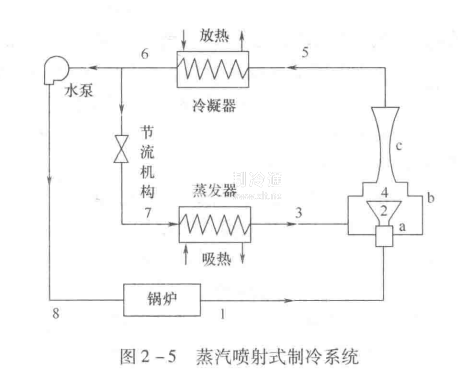 2-5所示為一個封閉噴射區制冷循環系統,制冷劑、冷卻介質和工作蒸汽均利用同一系統內的水。實際噴射式制冷循環系統可以是開啟式,冷凝的水不進人鍋爐和蒸發器而排人冷卻水池,作為循環冷卻水的補充水。蒸發器和鍋爐內的補給水則另設水源提供。