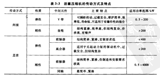 活塞壓縮機的傳動方式及特點如表3-3所示,各類驅動機的特點及其應用范圍如表3-4所示。