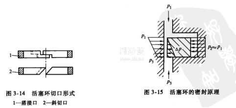 為了防止氣缸中的氣體從壓力較高的一端漏至壓力較低的一端,在活塞上裝有活塞環。活塞環在自由狀態時,其直徑稍大于氣缸直徑。裝人氣缸后,由于活塞環有切口,所以靠其本身的彈性,使環與氣缸壁緊密貼合。活塞環裝入活塞環槽內,與槽壁有一定間隙。活塞環數目隨活塞前后壓力差而異,壓力差愈大,活塞環愈多。活塞環的切口形式如圖3-14所示,斜開口用于直徑不大的活塞環,搭接口用于大直徑的活塞環。