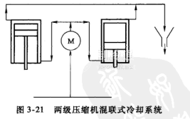 圖3-21為兩級壓縮機混聯式冷卻系統。冷卻水首先進人中間冷卻器,然后中間冷卻器出來的水分兩路進入一、二級氣缸水套,兩缸水套出水匯合流入后冷卻器。