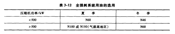 1)全損耗系統用油的選用。依照壓縮機功率按表3-12選用。