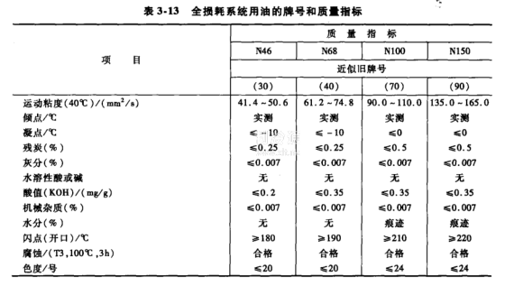 我國全損耗系統用油的牌號和質量指標如表3-13所示。