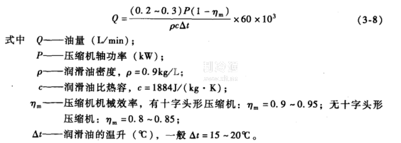(3)潤滑油量的計算曲柄連桿機構潤滑油的需要量,一般按潤滑油從摩擦表面導走的熱量來確定。通常,對有十字頭形壓縮機在這部分的摩擦功約為全部摩擦功的30%,無十字頭形壓縮機約為20%,則所需的油量為