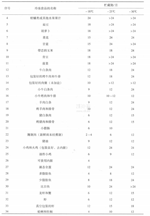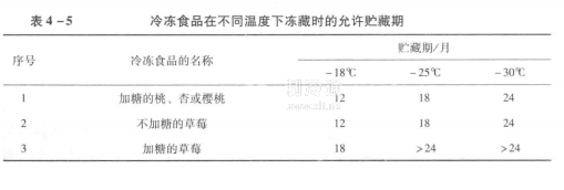 4-5列舉了一些食品在不同溫度下凍藏時的允許貯藏期限。從表4-5中數據可以看出,在同一凍藏溫度下,不同食品的凍藏期大體上存在如下規律:植物性食品的凍藏期大于動物性食品;在植物性食品中,蔬菜的凍藏期大于水果的;在水果中,加糖水果的凍藏期大于不加糖的水果;畜肉的凍藏期大于水產品;在畜肉中,牛肉的凍藏期最長,羊肉次之,豬肉最短;食品中,少脂魚的凍藏期大于多脂魚的,而蝦、蟹的凍藏期則處于少脂魚與多脂魚之間。
