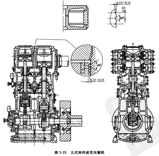 這類結構的密封零件不與氣缸壁相接觸,而由狹小縫隙內的氣流阻力產生密封效應。常用的形式是活塞的迷宮密封,如圖3-23所示。