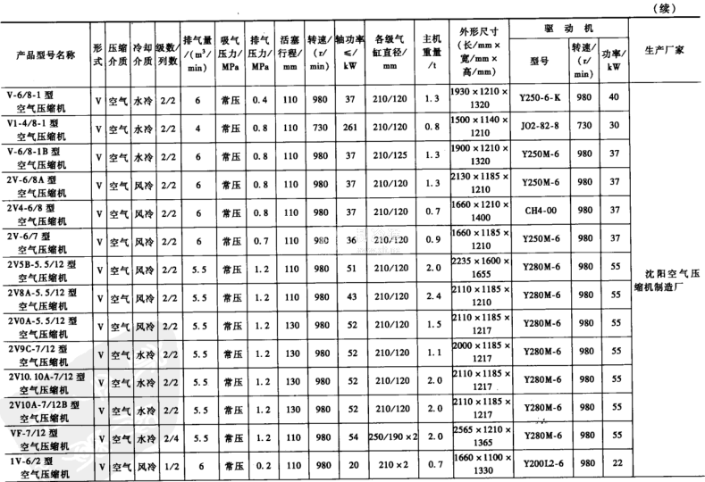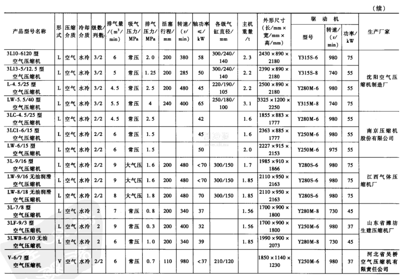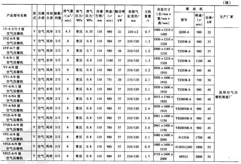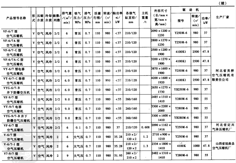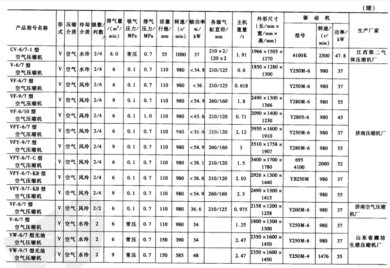 無油潤滑空氣壓縮機和常見的空氣壓縮機屬于3~9m/min低壓小型活塞空氣壓縮機,一些廠家設計制造的技術參數如表3-15所示。