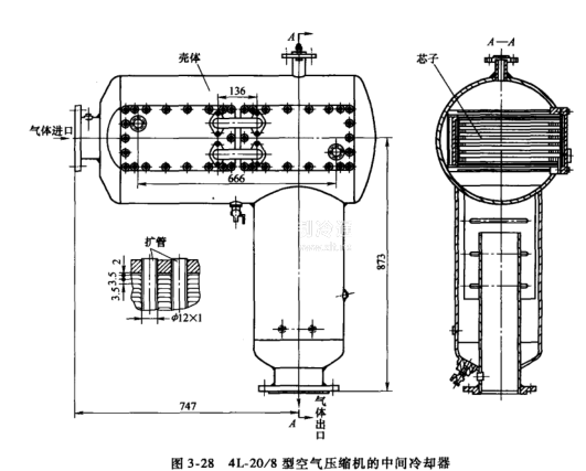 圖3-28為4L-20/8型空氣壓縮機的中間冷卻器,其外殼用鋼板焊接而成,空氣在管間流動。為清洗和拆裝方便,做成兩個芯子,水平放置于殼體內。芯子元件是將一束鋼管插人一組大散熱片中。散熱片材料為Q235,厚0.5mm。為保證散熱片與換熱管緊密接觸,以減小接合熱阻,通常浸錫或浸鋅。浸錫或浸鋅厚度一般在0.1~0.3mm。圖示冷卻器的空氣通道最窄斷面面積為0.0266m2,每只芯子為6程,每程管數12根,管子規格為