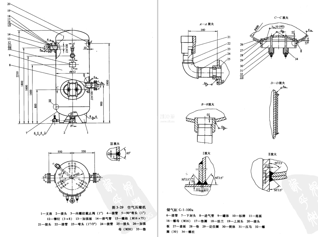 儲氣罐為立式結構。圖3-29為1m3儲氣罐結構圖。