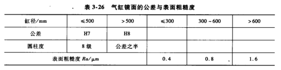 ①氣缸鏡面(缸套鏡面)的公差與表面粗髓度如表3-26所示。