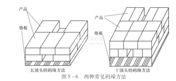 凍結肉在凍結物冷藏間存放時,必須碼放整齊。目前我國常用的凍肉包裝規格主要有以下幾種:25kg/件、20kg/件、15kg/件和10kg/件。大多數分割瘦肉、肥膘均采用25kg/件的包裝;心、肝、肚、蹄、舌以10kg/件的包裝居多:骨類產品多數以20kg/件、15kg/件包裝居多。凍結好的肉類產品在碼放時,根據規格的不同可以碼成“五頂頭(25kg/件或20kg/件)”、“九頂頭”和“十頂頭”,圖5-6給出“五頂頭”和“十頂頭”的碼垛方法。