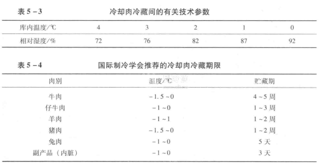 表5-3為冷卻肉冷藏時(shí)有關(guān)的技術(shù)參數(shù),表5-4為國際制冷學(xué)會推薦的冷卻肉冷藏期限(在實(shí)際應(yīng)用時(shí)應(yīng)將此表列時(shí)間縮短25%左右為好)。