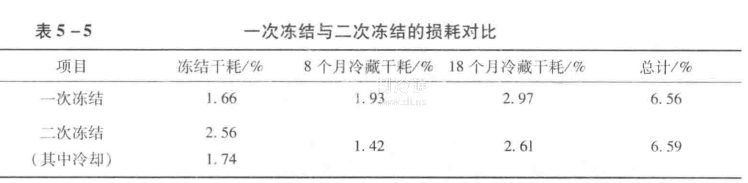 2)凍結損耗的比較  試驗數據表明采用一次凍結工藝生產的凍肉,其凍結損耗比采用二次凍結的損耗要小,約低0.88%,但其冷藏損耗要比二次凍結的冷藏損耗要大,綜合比較起來兩種凍結的總體損耗基本相同。表5-5給出了一次凍結和二次凍結的損耗對比。